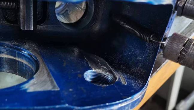 我們拆解檢查發(fā)現(xiàn),改扳手的兩側(cè)驅(qū)動板在同一位置發(fā)生斷裂,油缸外沿刮擦缺損嚴重,殼體內(nèi)腔出現(xiàn)嚴重刮削凹痕,整個扳手內(nèi)部充滿金屬碎屑。從各部位損傷跡象我們可以推導(dǎo)出最先出現(xiàn)問題的應(yīng)該是驅(qū)動板。長期高負荷運行或者使用過程中的受力不均導(dǎo)致液壓扳手驅(qū)動板出現(xiàn)損傷,但彼時并沒有達到非常嚴重的斷裂,扳手有些微卡但依然能夠轉(zhuǎn)動使用,導(dǎo)致操作人員沒有及時發(fā)現(xiàn)和處理。但這個時候裂痕使得驅(qū)動板不再光滑,并與殼體及油缸外沿產(chǎn)生接觸和刮削嚴重損傷了油缸和殼體。同時,刮擦下來的金屬碎屑又在運動中進入棘輪棘爪,對棘輪棘爪也造成了不小傷害。本來只用更換驅(qū)動板,卻差點毀了整個扳手。